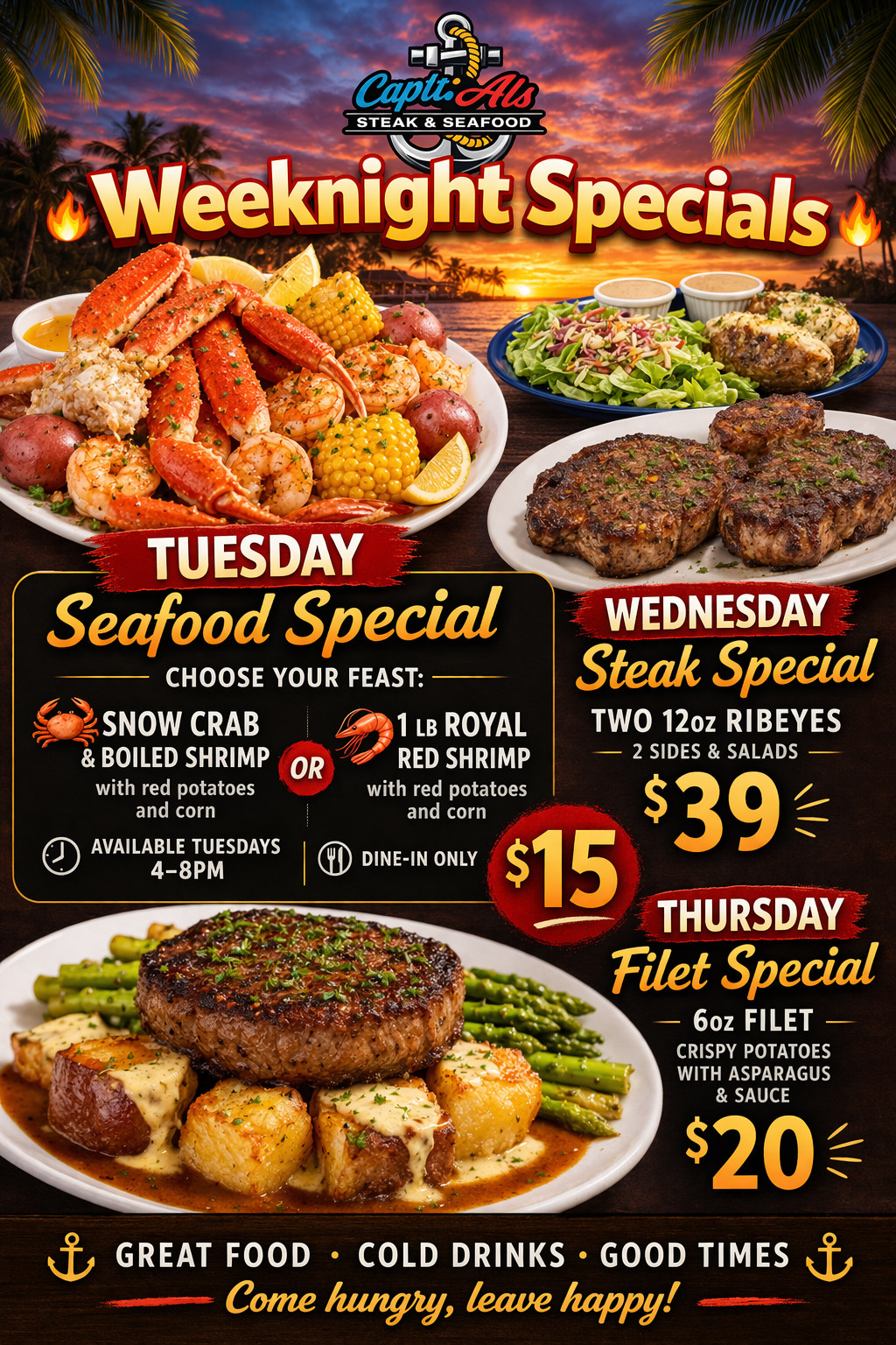 Tuesday seafood, Wednesday steak, and Thursday filet specials.